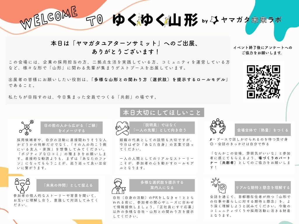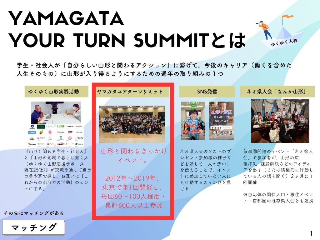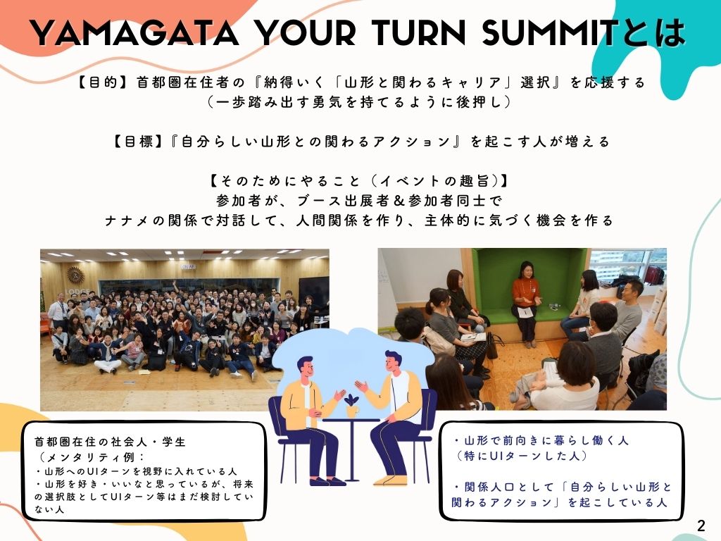 ヤマガタユアターンサミットは、首都圏在住者の『納得いく「山形と関わるキャリア」選択』を応援し、自分らしい山形との関わるアクション』を起こす人が増えることを目指すイベントです。