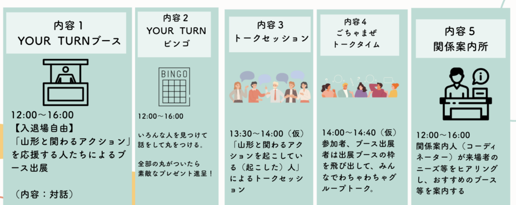 「YOUR TURNブース」では、企業の採用担当の方、二拠点生活を実践している方、コミュニティを運営している方など、様々な形で「山形」に関わる先輩が集まりゲストブースを出展し、参加者と対話。