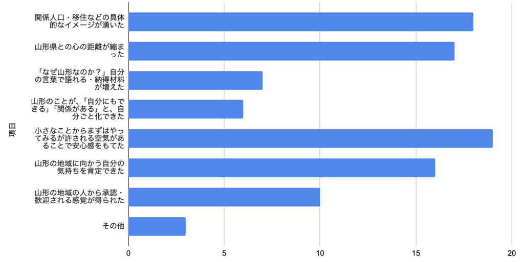 多い順に「安心感を持てた」「関係人口・移住などの具体的なイメージが湧いた」「山形県との心の距離が縮まった」「山形の地域に向かう自分の気持ちを肯定できた」