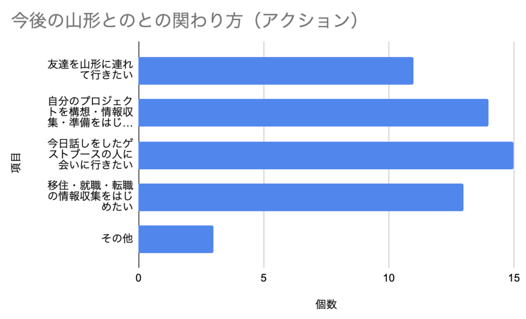多い順に「今日話をしたゲストブースの人に会いに行きたい」「自分のプロジェクトを構想・情報収集・準備をはじめたい」「移住・就職・転職の情報収集をはじめたい」