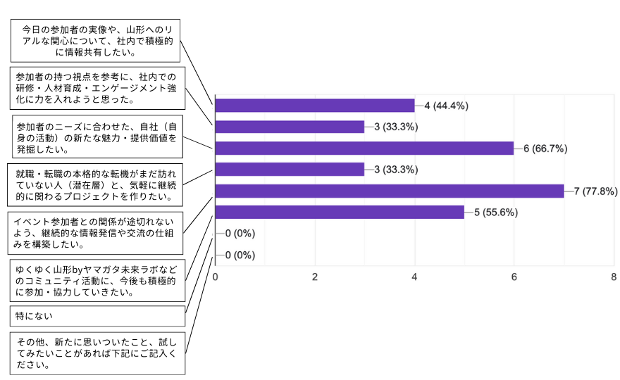 多い順に「イベント参加者との関係が途切れないよう、継続的な情報発信や交流の仕組みを構築したい。」「参加者のニーズに合わせた、自社(自身の活動)の新たな魅力・提供価値を発掘したい。」「ゆくゆく山形byヤマガタ未来ラボなどのコミュニティ活動に、今後も積極的に参加・協力していきたい。」という声でした。