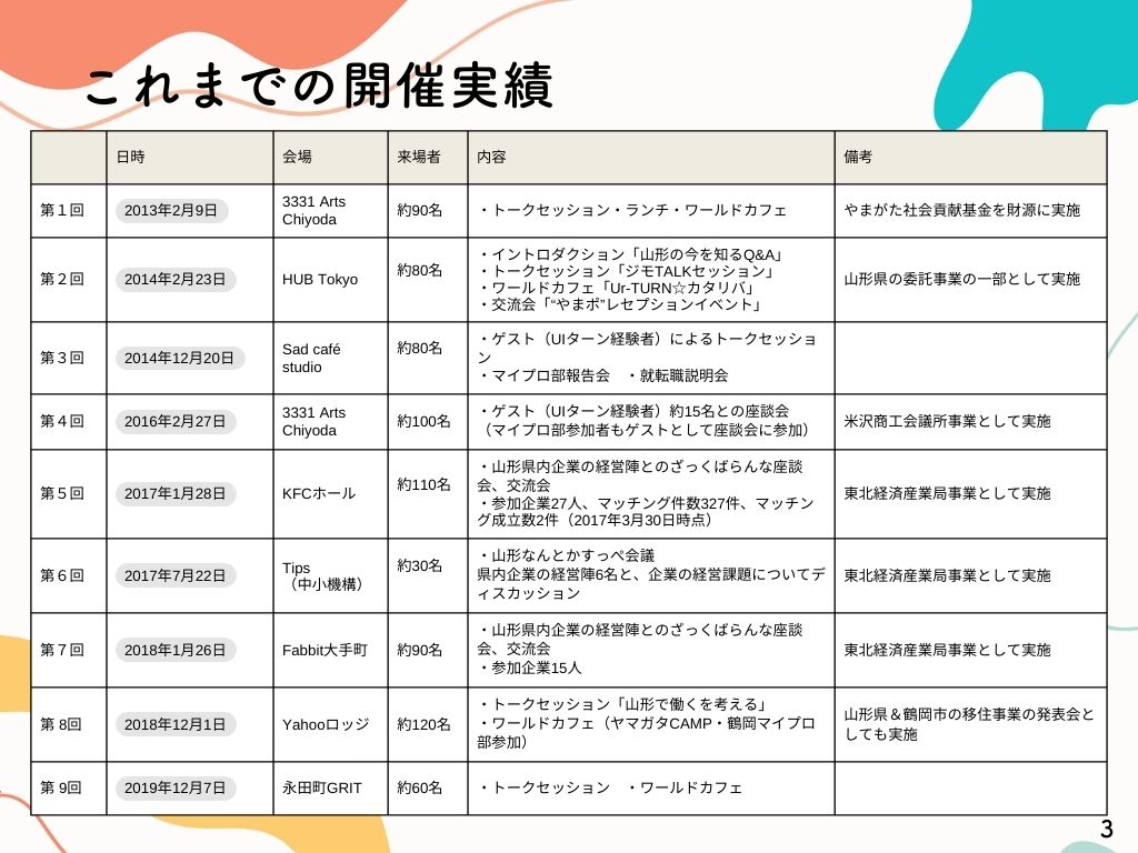 年1回のお祭りのような雰囲気で、硬い説明会ではなく「参加者とゲスト」「参加者同士」が対話するのがメインで、上下関係なしで山形へのアクションを後押しします。