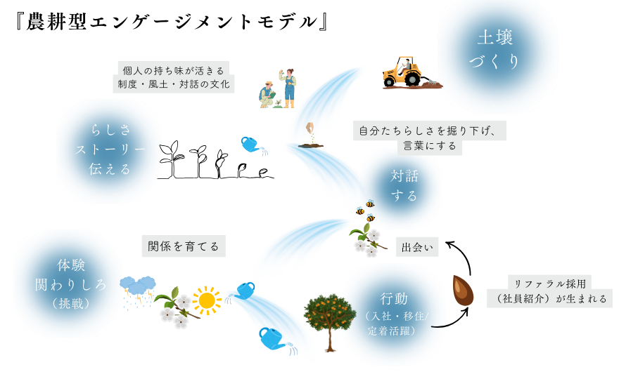 「農耕型エンゲージメントモデル」では、土壌(個人を受け入れる側のコミュニティ(組織や地域)の風土)を整え、自社の「らしさ」を言語化し、ナナメの関係を通じて信頼を積み上げていく考え方です。最終的には、社員や住民などの中の人から自然と「うちの会社・地域いいよ。一緒に働こうよ・暮らそうよ。」という声が周囲の人に掛けられる『リファラル(採用)』が生まれる状態を目指します。